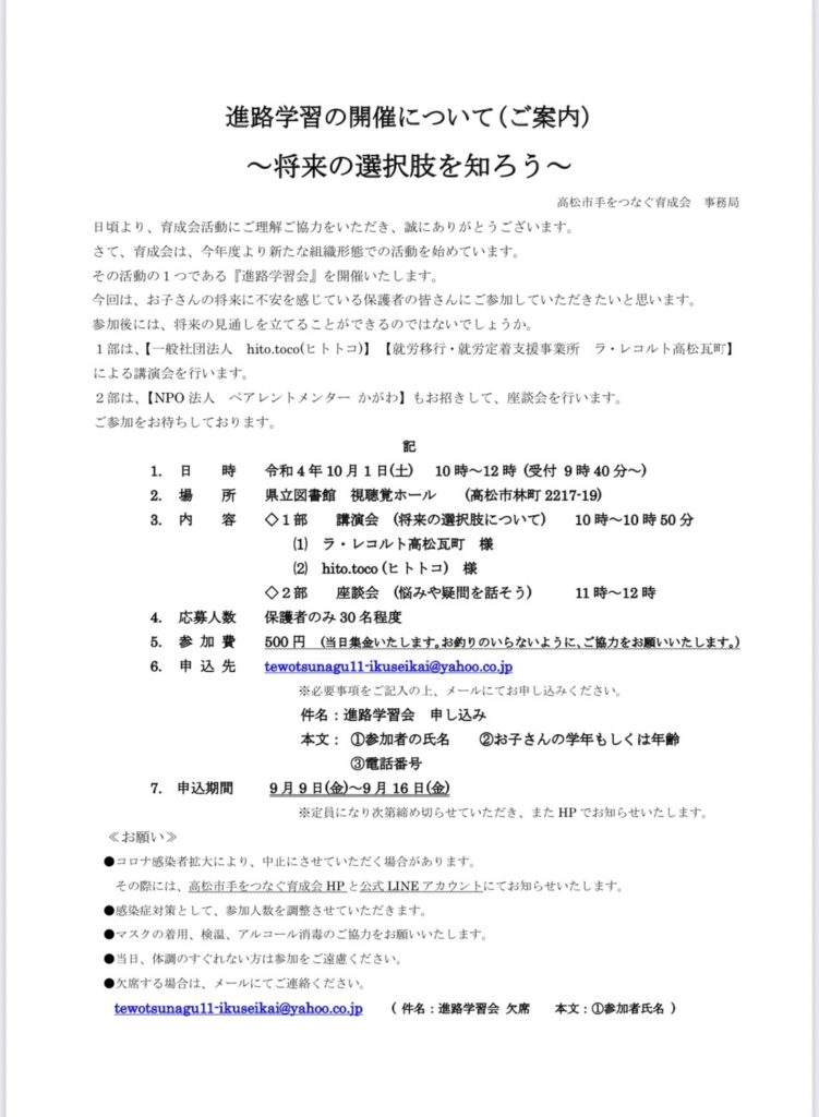 Home › お知らせ › 再度ご確認を😊 2022-09-16 再度ご確認を😊 先日お知らせした、進路学習会の案内ですが、まだ参加募集可能なようです。 案内の下記のメールより是非申し込み下さい。 (崎) 関連記事 本日より申し込み開始です🎵 座談会のご案内✨ 本日の忘れ物です。 県育成会からのお知らせです😁 ホームページ開設 おはようございます✨ 進路学習会・追加