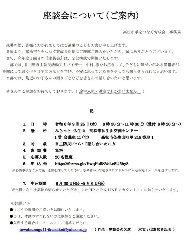 先日案内しました座談会・講演の申し込みが本日までとなっております。人数に余裕があるようです。
