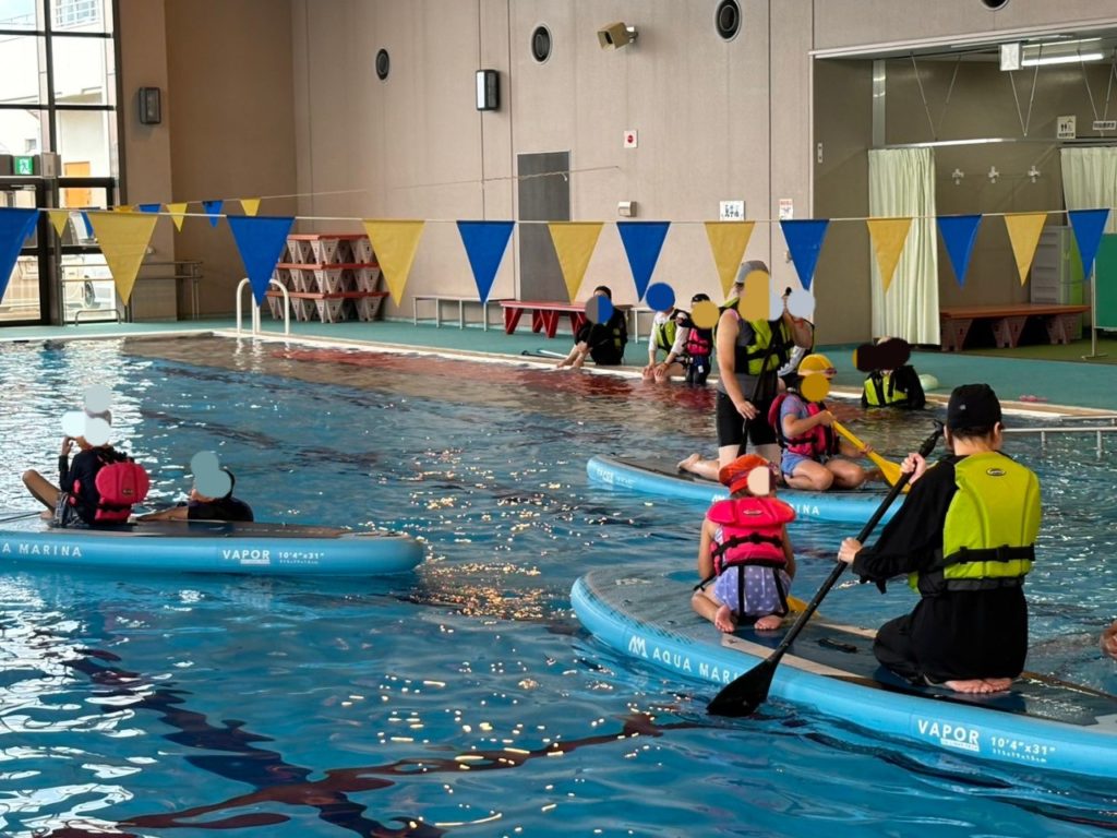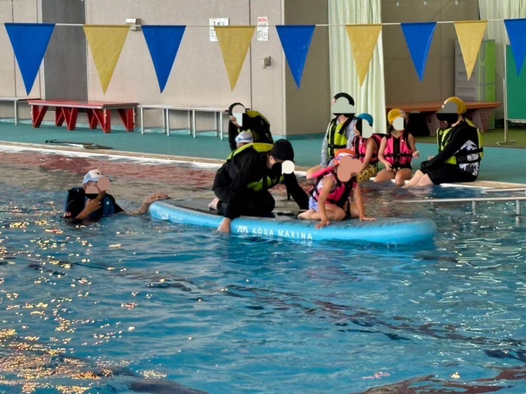 最初は水に濡れるのも嫌だった子がだんだん慣れて、最後は魔法のじゅうたんと呼ばれる巨大マットの上に、全員が子供だけで乗ることができました🏄️
