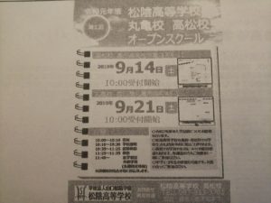 Home › お知らせ › お知らせ(o^-^o)4️⃣ 2019-08-01 お知らせ(o^-^o)4️⃣ 進路学習会の参加校・松陰高等学校の オープンスクールの案内です。 関連記事 進路学習会・追加 令和2年度高松市手をつなぐ育成会総会資料 県育成会からのお知らせです😁 アンケートのお願い🍀 西部ブロックの皆さん✨ お知らせ!(^^)!3️⃣ お知らせ(o^-^o)5️⃣